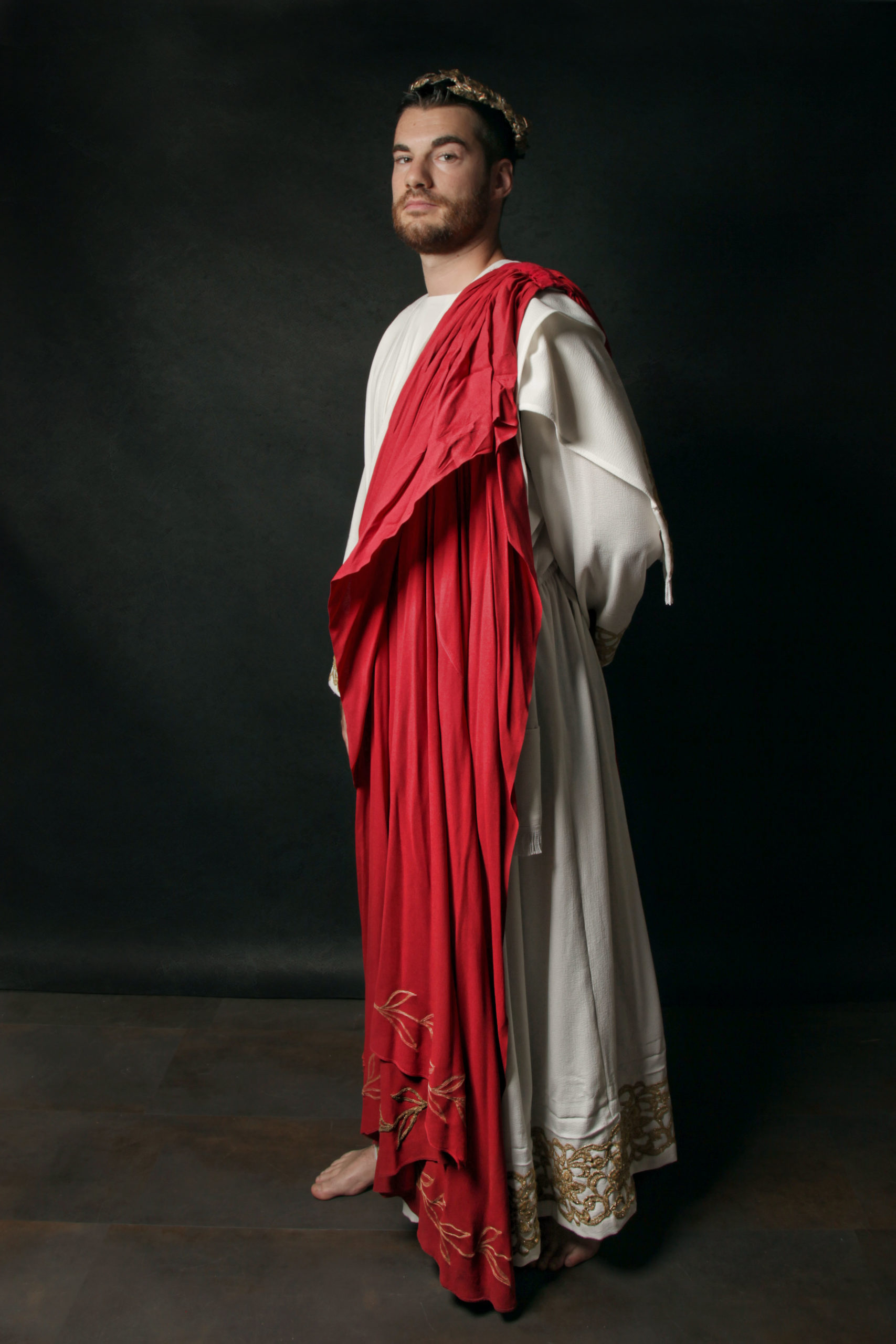 Le costume comprend une longue tunique blanche bordée de galons dorés, une ceinture, une toge rouge très ample rebrodée de feuilles de laurier sur le contour et une couronne de laurier en métal repoussé.