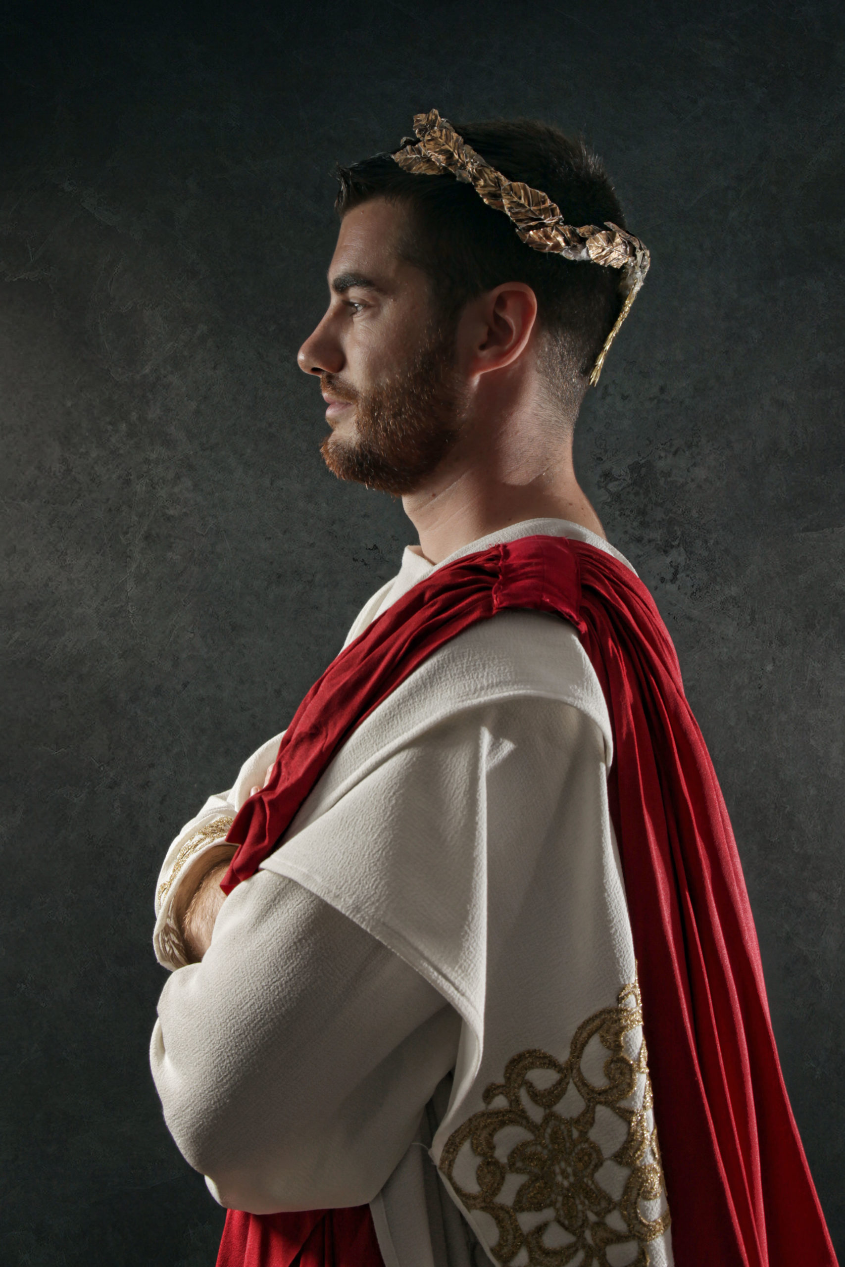 César, empereur romain porte : une tunique d’apparat bordée de galons dorés, une ceinture, une  toge rouge brodée d’un motif de laurier, arbuste consacré à Apollon qui symbolise le succès et la victoire et une couronne de laurier en métal repoussé.